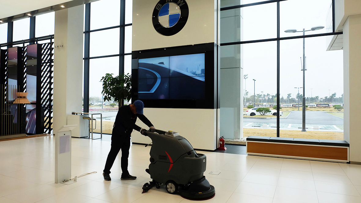 然后打開洗地機電源,放下吸水扒和刷盤,開啟刷盤電機開關(guān)和吸水電機開關(guān),調(diào)節(jié)放水閥,推動洗地機前進洗地。