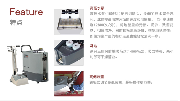 強(qiáng)力噴射,高速擺刷,真空抽吸三合一,清洗效果顯著,污漬地毯一經(jīng)清洗,快速恢復(fù)原貌。適用于賓館的餐廳、KTV和餐飲酒樓等場所,適合污染嚴(yán)重和深層藏有大量污垢的地毯作清洗翻新使用。
