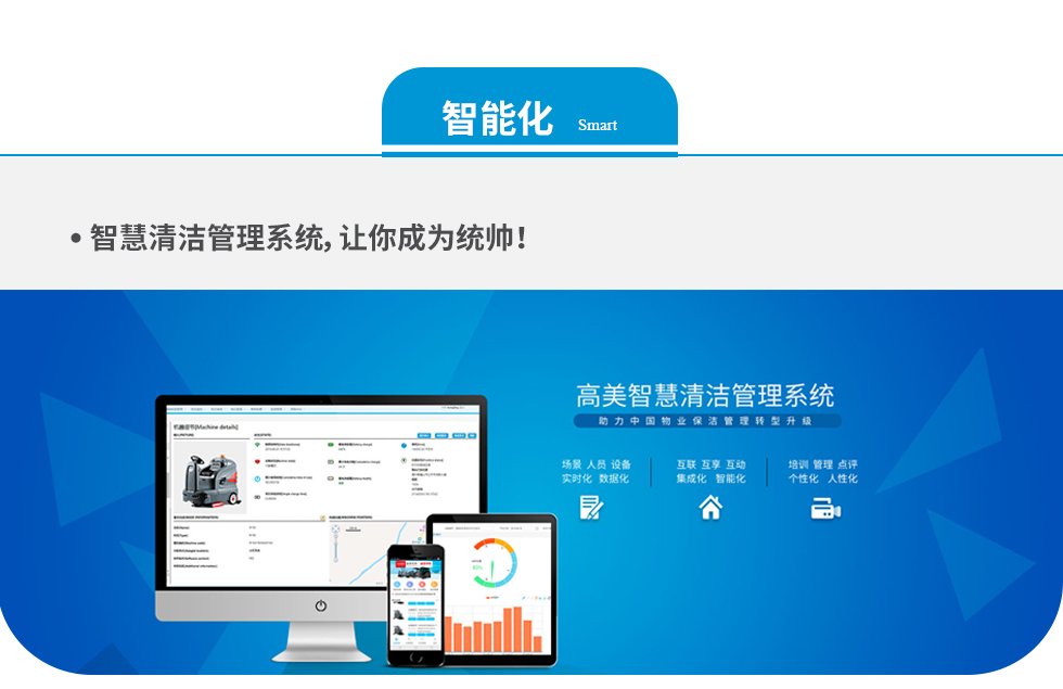 高美,著力打造代表行業(yè)高端專業(yè)化的智慧清潔體驗(yàn)館。高美智慧清潔管理系統(tǒng)和高端清潔設(shè)備,實(shí)現(xiàn)場(chǎng)景、人員、設(shè)備實(shí)時(shí)化和數(shù)據(jù)化,結(jié)合互聯(lián)網(wǎng)和大數(shù)據(jù),打造數(shù)據(jù)平臺(tái),讓數(shù)據(jù)賦能企業(yè)。高美以應(yīng)有的使命和擔(dān)當(dāng),引領(lǐng)行業(yè)新一輪智能化潮流,為行業(yè)發(fā)展貢獻(xiàn)高美方案。