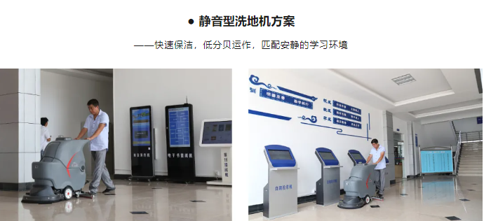 圖書館、教學(xué)樓等,地面多為瓷磚、水磨石等材質(zhì),清潔以除灰為主,但對(duì)環(huán)境噪音要求嚴(yán)格,清潔作業(yè)需靜音進(jìn)行。